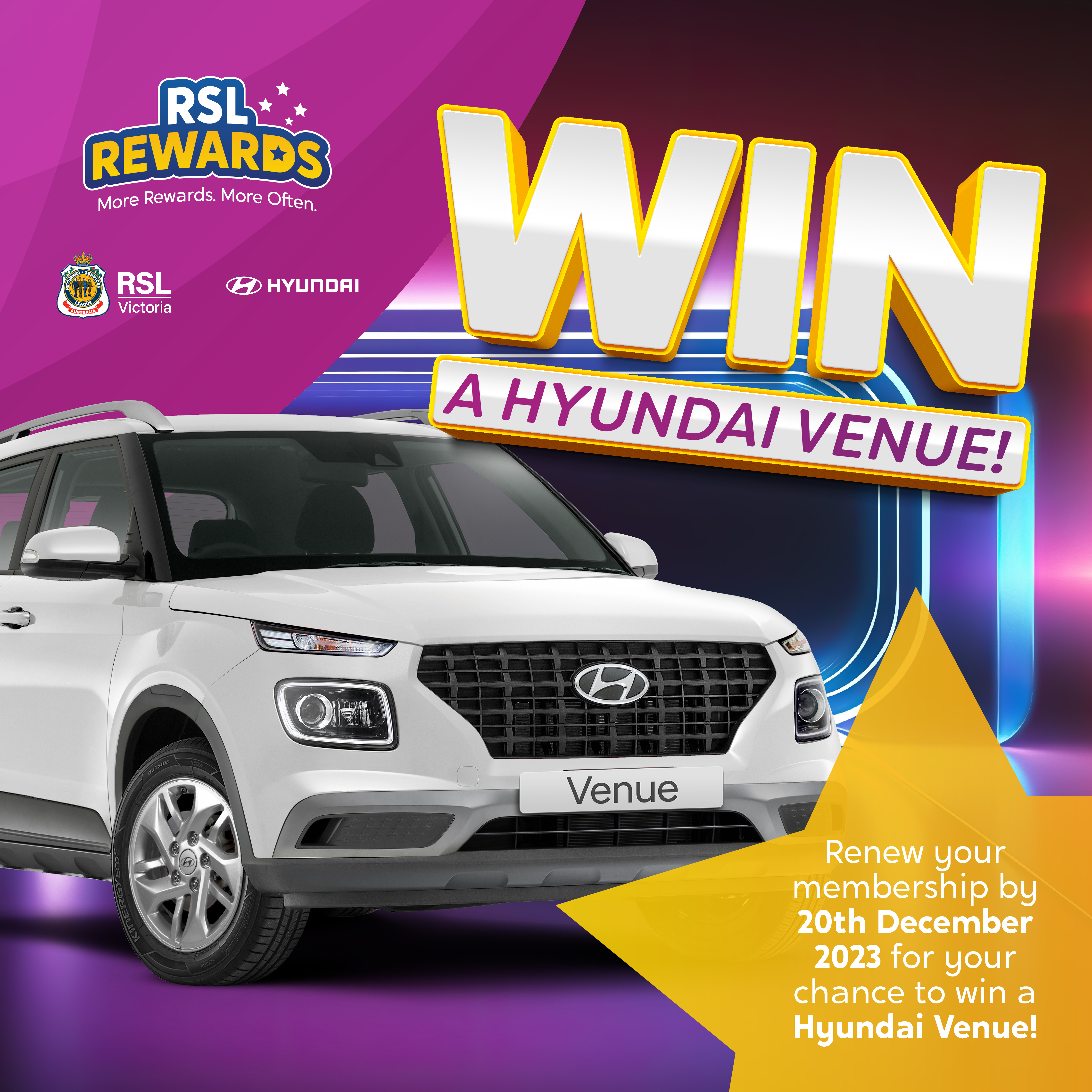 All New and Renewing Members go in the draw to win a Hyundai Venue Competion closes December 20th 2023