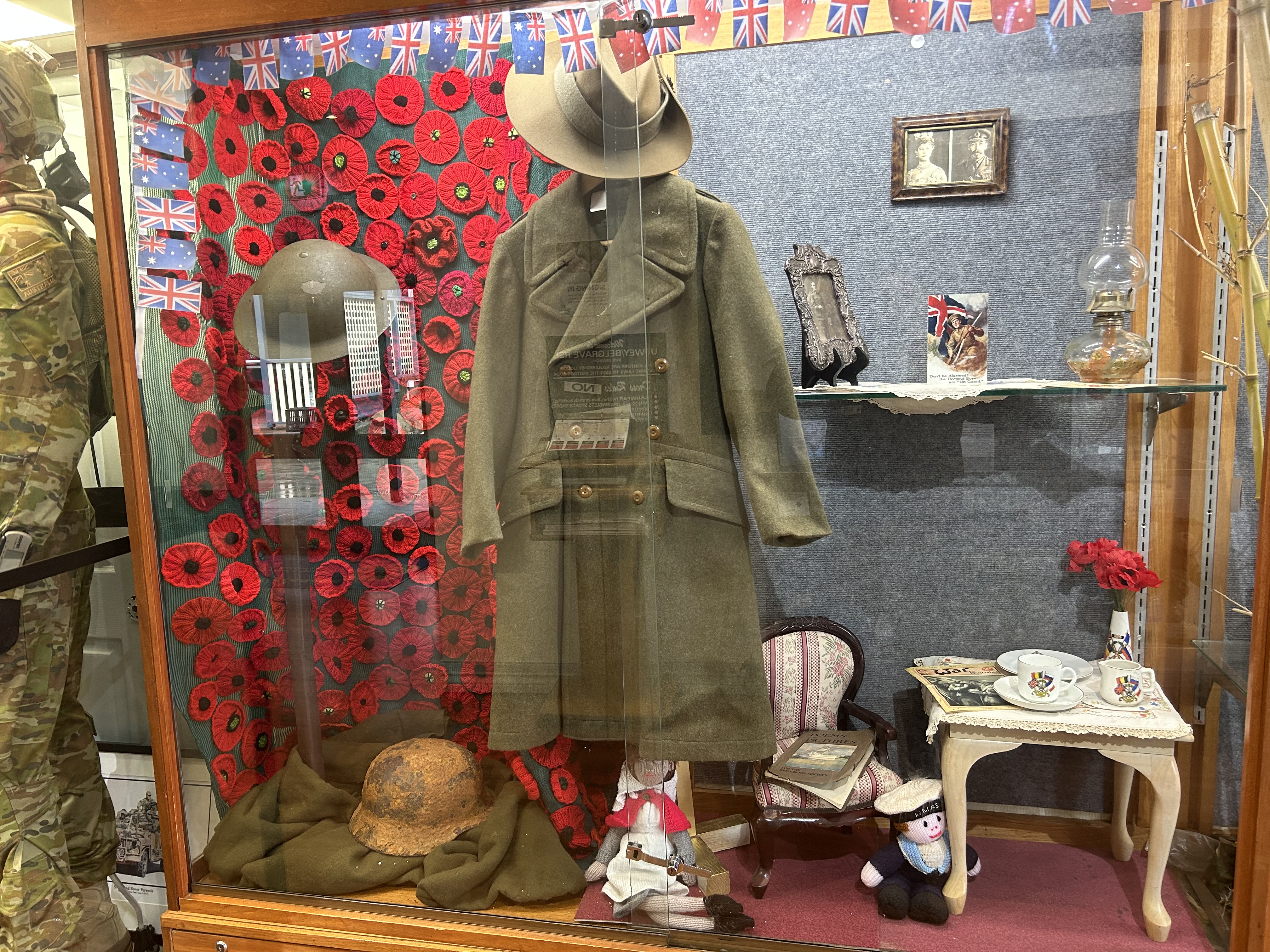 The display represents remembrance at home with the red poppies and a home setting that would have been in World War 1