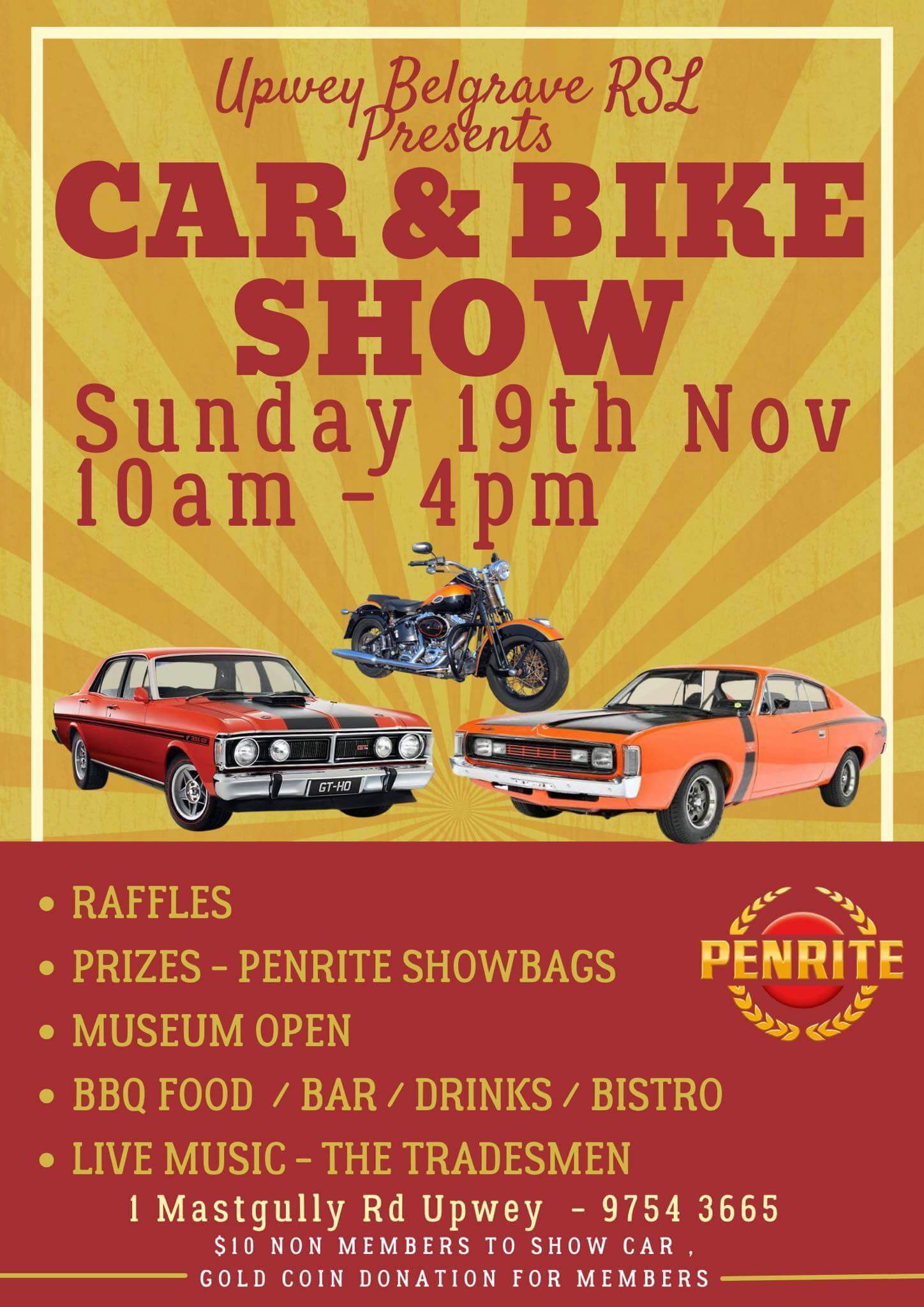 Car and Bike Show Sponsored by Penrite Sunday 19th November. 10am to 4pm. $10 to show your car/bike for Non Members Gold Donation for Members You are welcome to display your car or bike all day or for a few hours, the choice is yours. Gold coin donation for pedestrians. Bistro will be open as well as a BBQ. All welcome!!