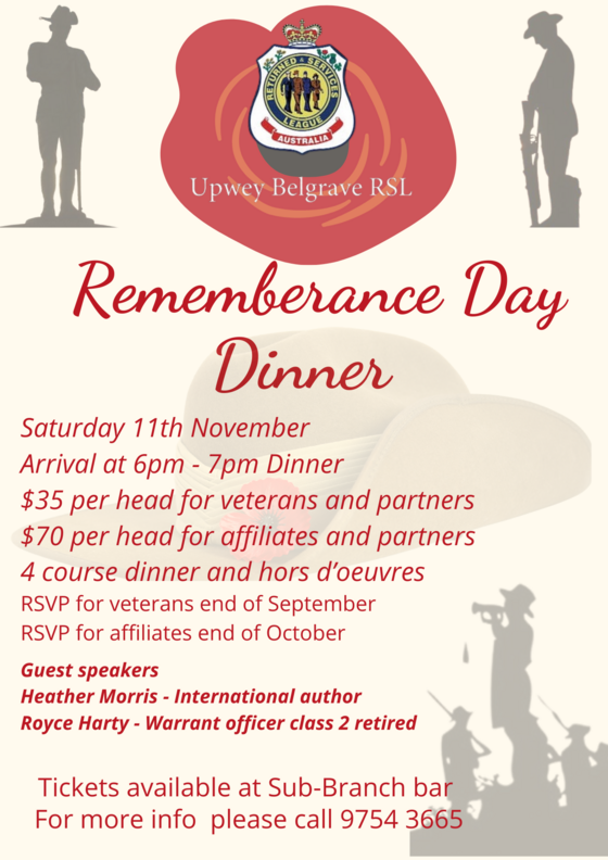 Remembrance Day Dinner Saturday 11th November 6pm Onwards 5 Course dinner and canapés Free for Veterans and partners $70 per head for Affiliates and partners |